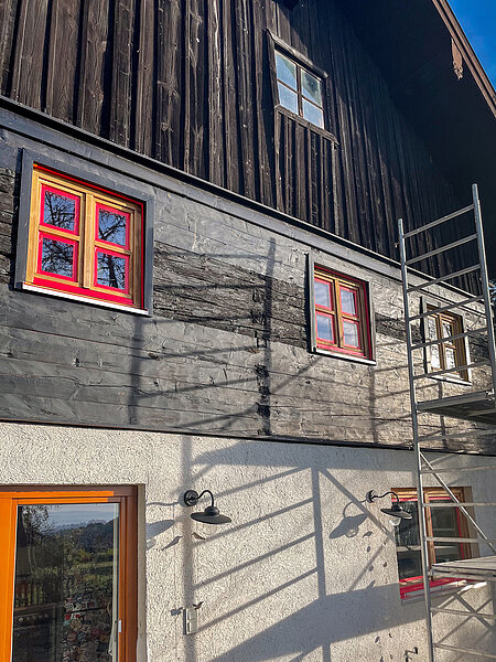 Die Holzfenster waren durch UV-Strahlung, Regen und allgemeine Umwelteinflüsse stark beansprucht. Um den Wetterschutz wiederherzustellen, wurden alle Elemente vollständig überarbeitet und mit der hochwertigen GORI 99 Dickschichtlasur neu beschichtet.