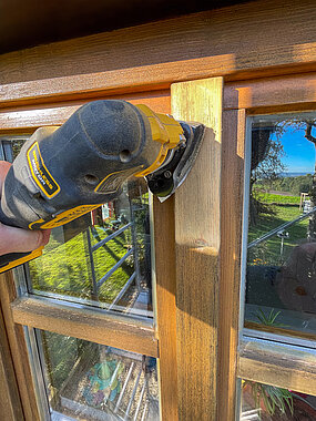 - Reinigung & Vorprüfung – Entfernen von Schmutz, Staub und losen Altbeschichtungen; Kontrolle des Holzes auf Feuchtigkeit und Schäden.