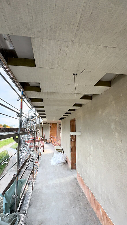 Bei diesem Objekt wurde die komplette Deckenfläche eines großen Wohnblocks gedämmt. Die Montage erfolgte von unten an der Betondecke.