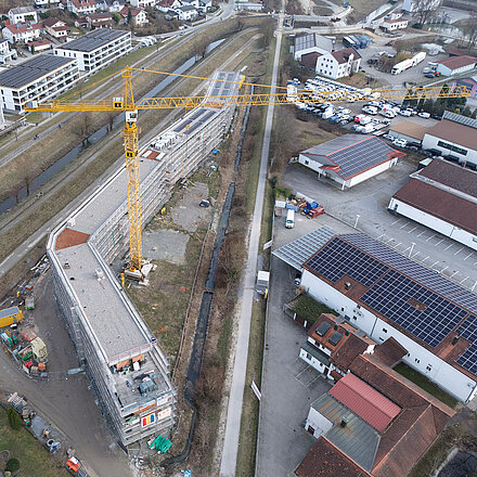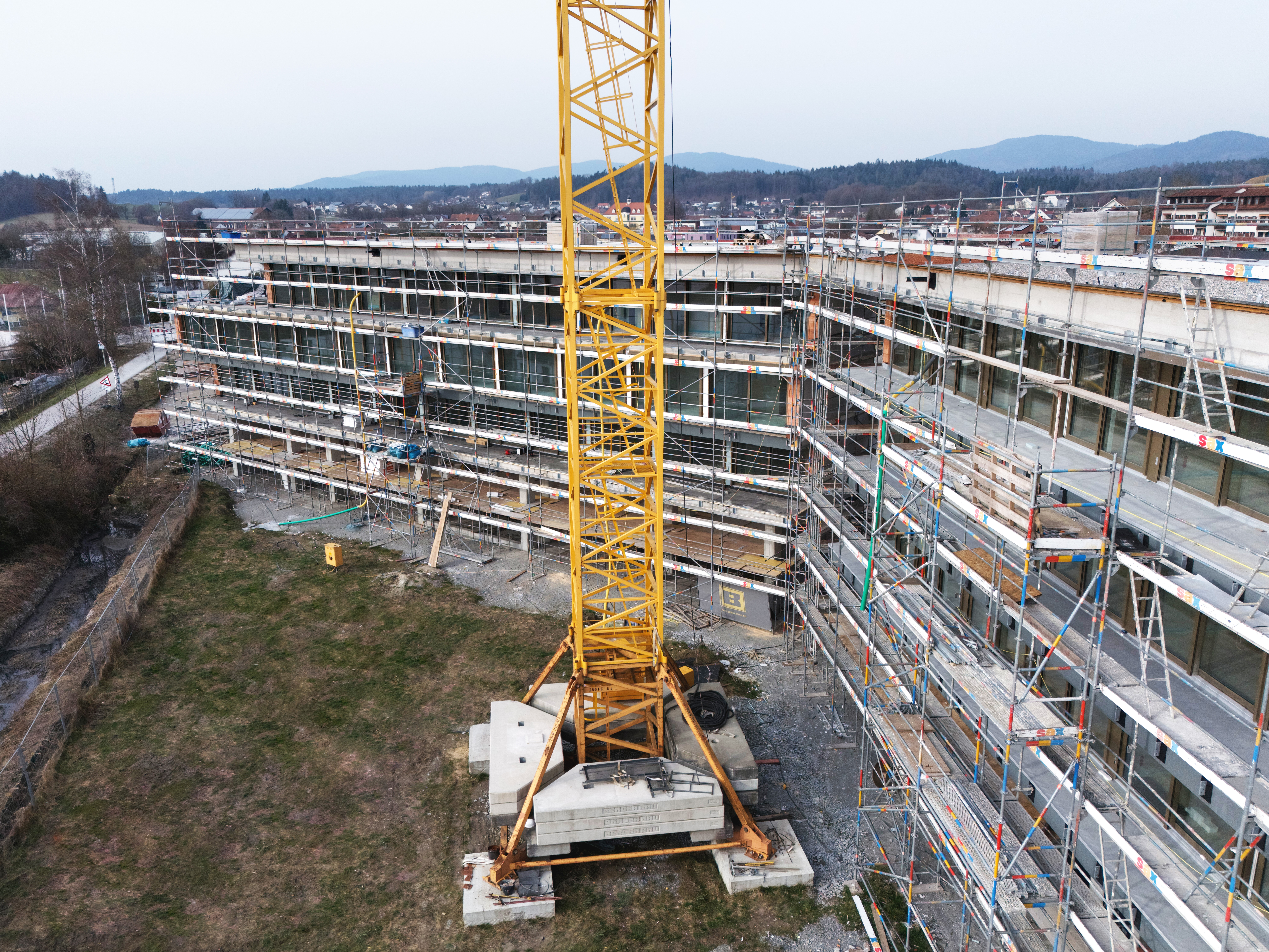 - Arbeiten auf Gerüsten entlang der gesamten Gebäudelänge