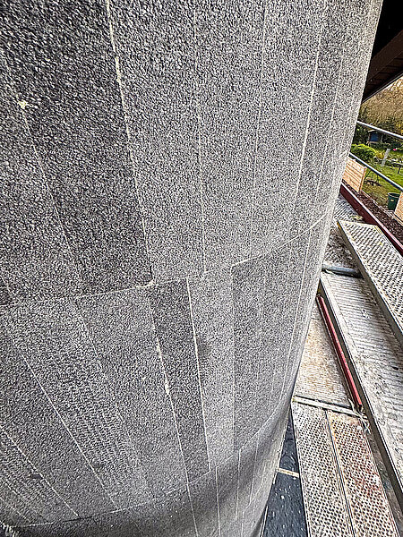 - Moderne, ruhige Fassadenoptik – der Scheibenputz sorgt für eine gleichmäßige Oberfläche und hebt die vorhandene Architektur hervor, ohne den Charakter des Bestandsgebäudes zu zerstören – insbesondere im Bereich der Rundung.