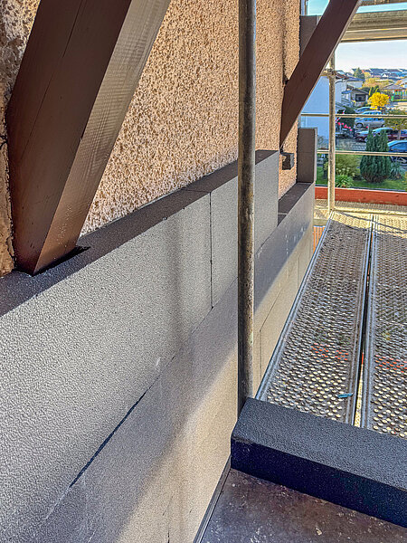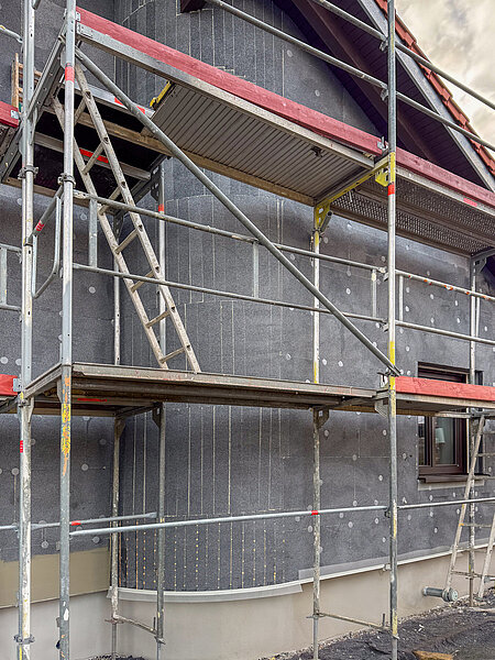 Für die Fassadensanierung wurde ein Wärmedämmverbundsystem mit 12 cm starken Graphit-Dämmplatten verwendet. Die dunklen EPS-Graphitplatten mit einer geringen Wärmeleitfähigkeit von etwa λ = 0,032 W/mK ermöglichen eine hohe Dämmleistung bei schlankem Wandaufbau – ein wichtiger Baustein für das Erreichen des KfW-40-Standards in Verbindung mit weiteren energetischen Maßnahmen.