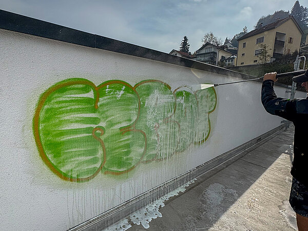 - Schonende Reinigung – Spezielle Reinigungsmittel, die die Fassade nicht angreifen, sondern gezielt auf die Farbstruktur des Graffitis reagieren.
