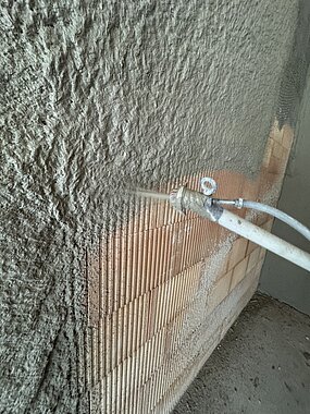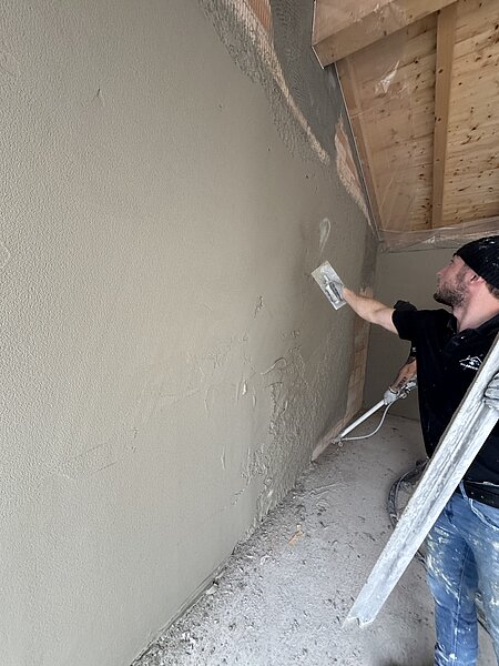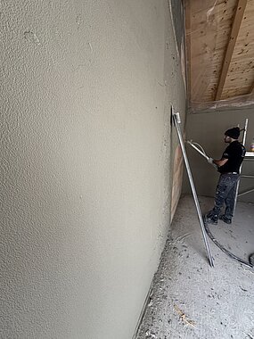 Nach dem ersten Putzauftrag (Grundlage zur Egalisierung des Untergrundes) erfolgte der zweite Putzdurchgang in erhöhter Qualitätsstufe. Die Oberfläche wurde hierbei gefilzt, sodass eine gleichmäßige, feine und optisch hochwertige Struktur entstand. Diese Filzstruktur eignet sich ideal als Endoberfläche oder als perfekter Untergrund für weitere Beschichtungen.