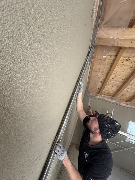 Der eingesetzte Kalkputz bietet zahlreiche Vorteile: Er ist diffusionsoffen, feuchtigkeitsregulierend und unterstützt ein gesundes Raumklima. Gerade im Neubau sorgt diese Eigenschaft für einen kontrollierten Feuchtigkeitsaustausch und eine nachhaltige Bauweise. Zudem wirkt Kalkputz aufgrund seiner natürlichen Alkalität schimmelhemmend. Die Verputzarbeiten wurden gemäß den geltenden handwerklichen Regeln und Qualitätsstufen fachgerecht ausgeführt. Das Ergebnis ist eine fluchtgerechte, ebene Wandfläche in hoher Ausführungsqualität.